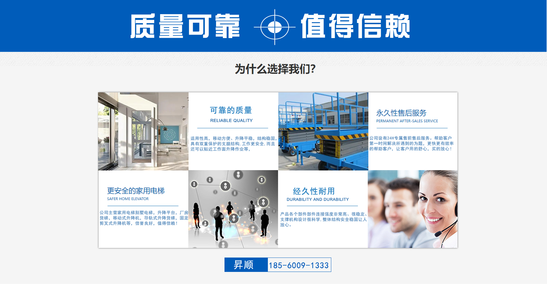 山東昇順液壓升降機(jī)械有限公司是一家主營(yíng)家用電梯,別墅電梯,升降平臺(tái),廠房貨梯,移動(dòng)式升降機(jī),導(dǎo)軌式升降貨梯,固定剪叉式升降機(jī)等產(chǎn)品企業(yè),質(zhì)量可靠,值得信賴。 用戶至上,以用戶為中心”是公司永遠(yuǎn)堅(jiān)持的服務(wù)宗旨,贏得用戶的贊許是我們的榮譽(yù),及時(shí)滿足用戶的需求,是我們公司的愿望。長(zhǎng)期以來,公司員工以優(yōu)質(zhì)的服務(wù),取悅于用戶,以誠(chéng)信的言行取信于用戶,得到了用戶們的好評(píng)。我們期待著與您更加愉快的合作!公司的發(fā)展,離不開社會(huì)的大力支持,在社會(huì)的支持和幫助下,我們正昂首闊步邁向未來! 我們的經(jīng)營(yíng)方針是:以質(zhì)量求生存,以產(chǎn)品求發(fā)展,以信譽(yù)保合作,以服務(wù)贏客戶。 本公司對(duì)產(chǎn)品質(zhì)量和各項(xiàng)服務(wù)恪守合同承諾,并愿與新老客戶精誠(chéng)合作,共創(chuàng)未來。 公司精神:創(chuàng)新是主題,超越是不懈的追求。 公司宗旨:信譽(yù)保證,誠(chéng)信為本。 我們會(huì)以合理的價(jià)格,良好的信譽(yù),雄厚的實(shí)力,優(yōu)質(zhì)的產(chǎn)品,最周到的服務(wù),服務(wù)于廣大新老客戶!...